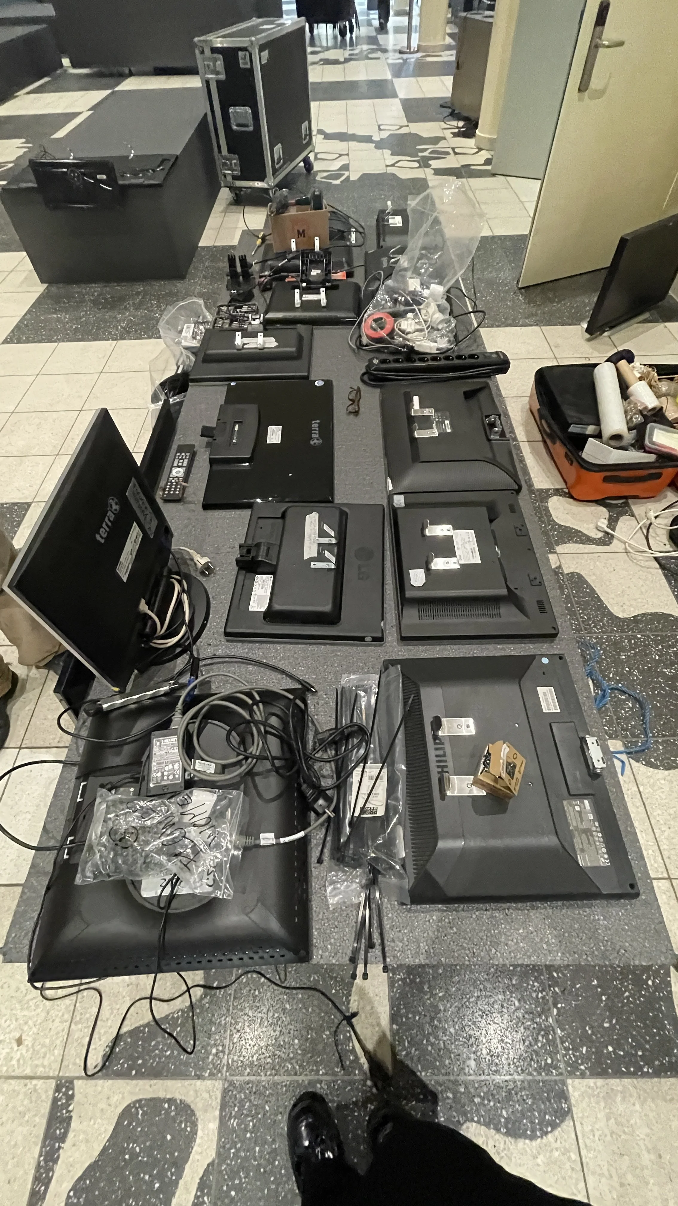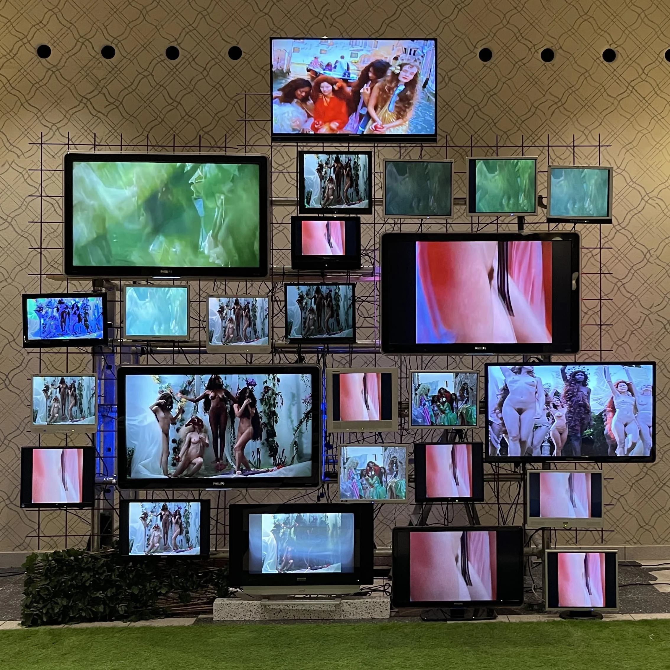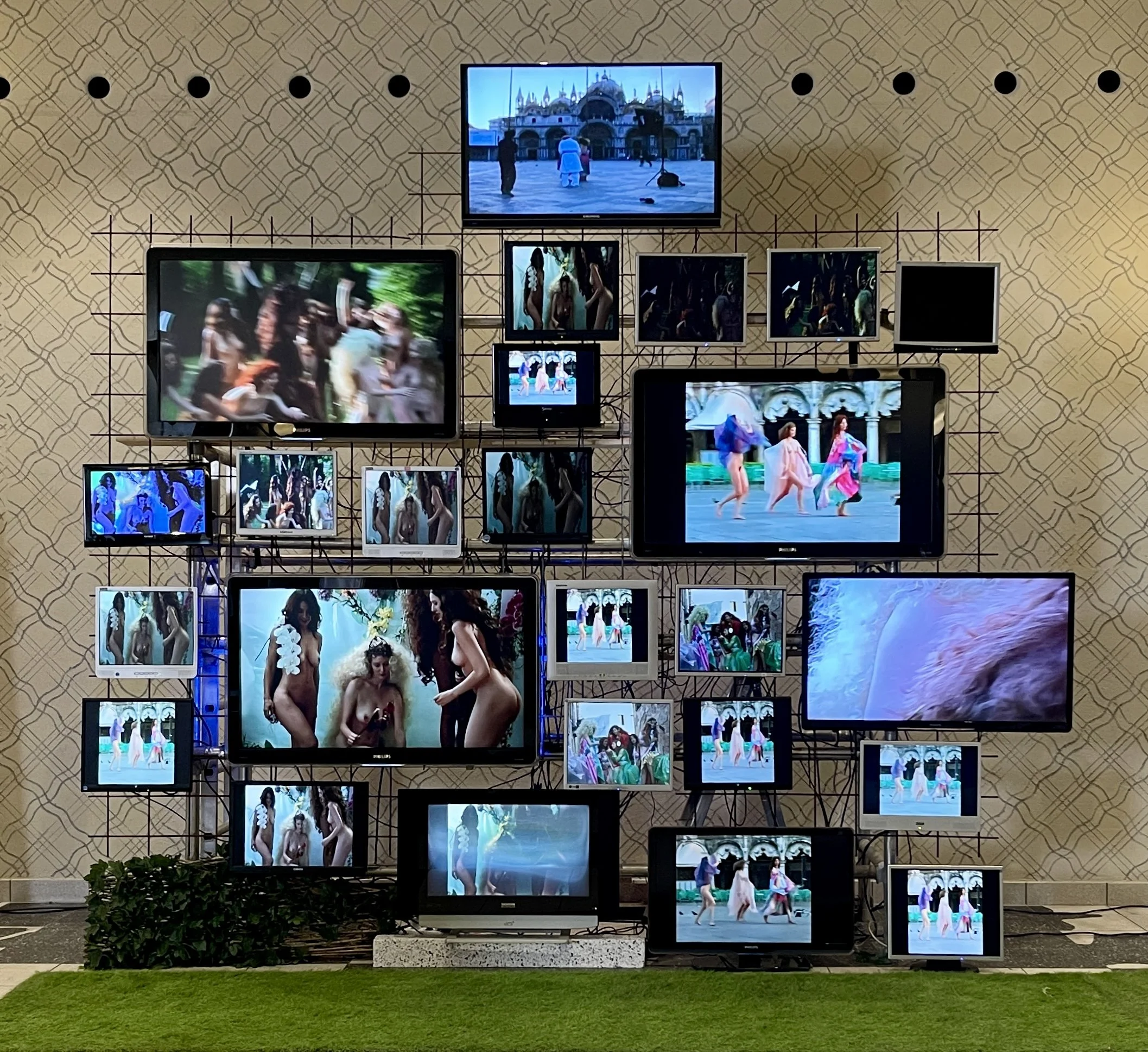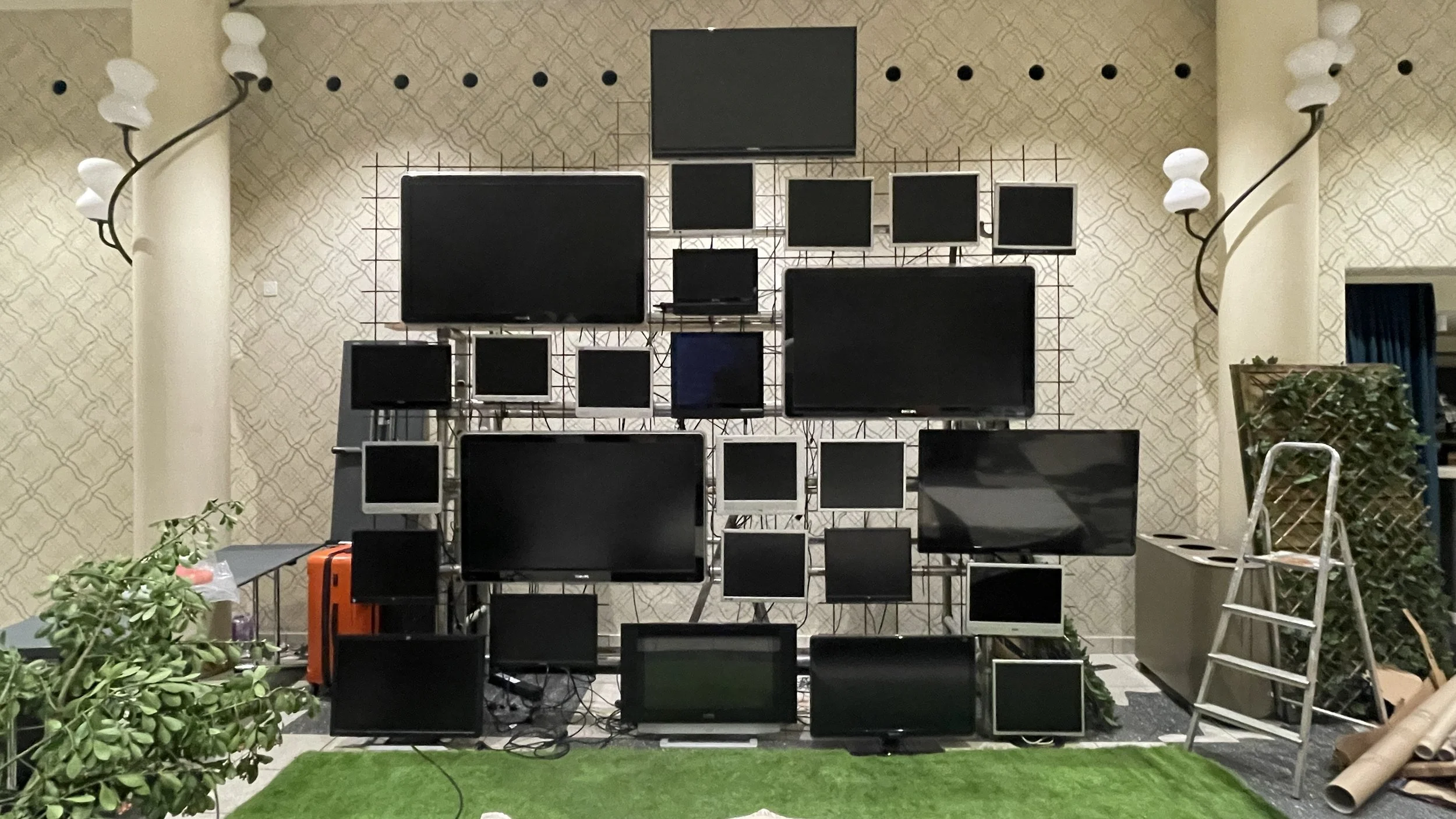 Medium: Video installation, 25 recycled TV screens of different sizes