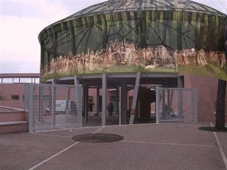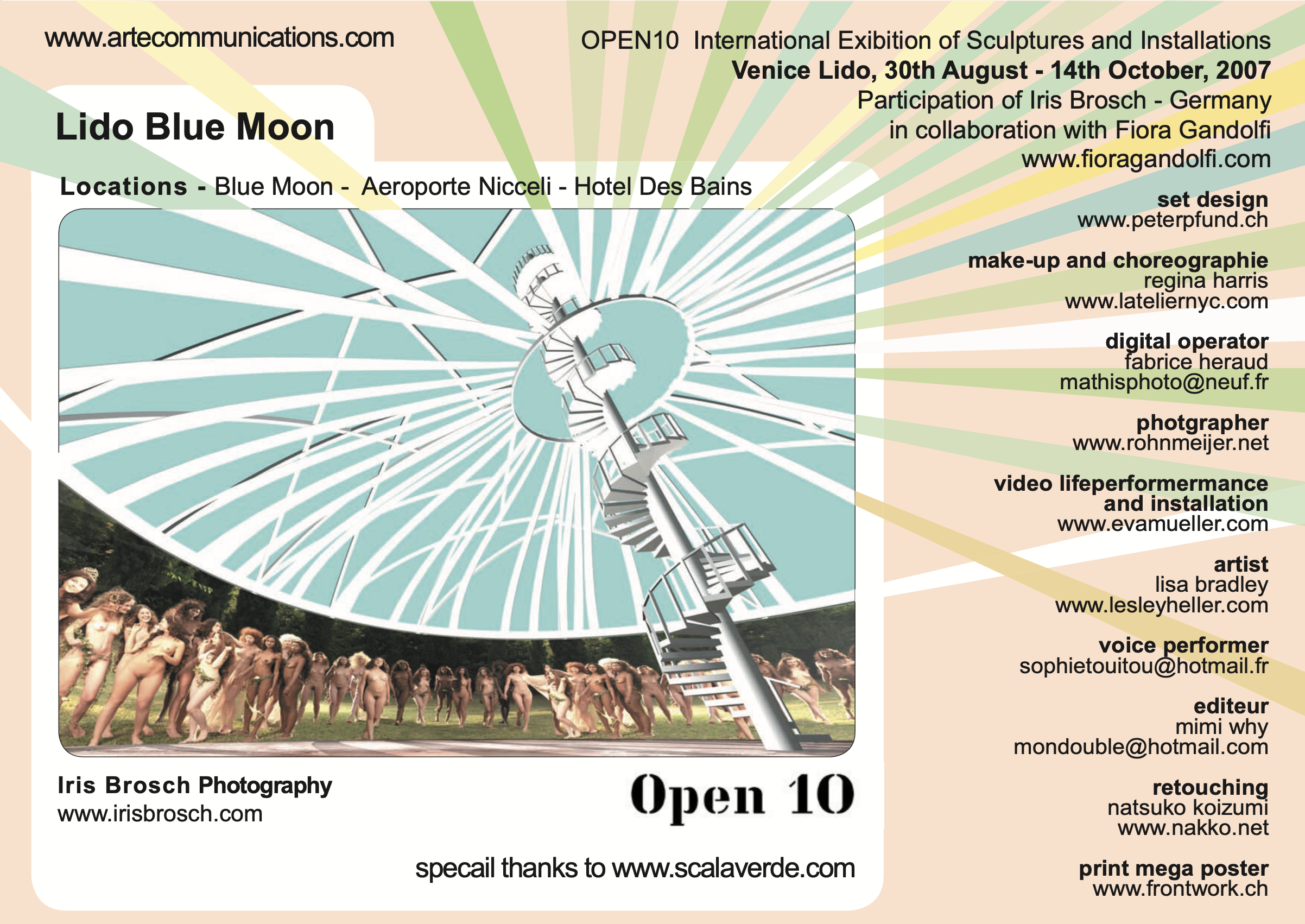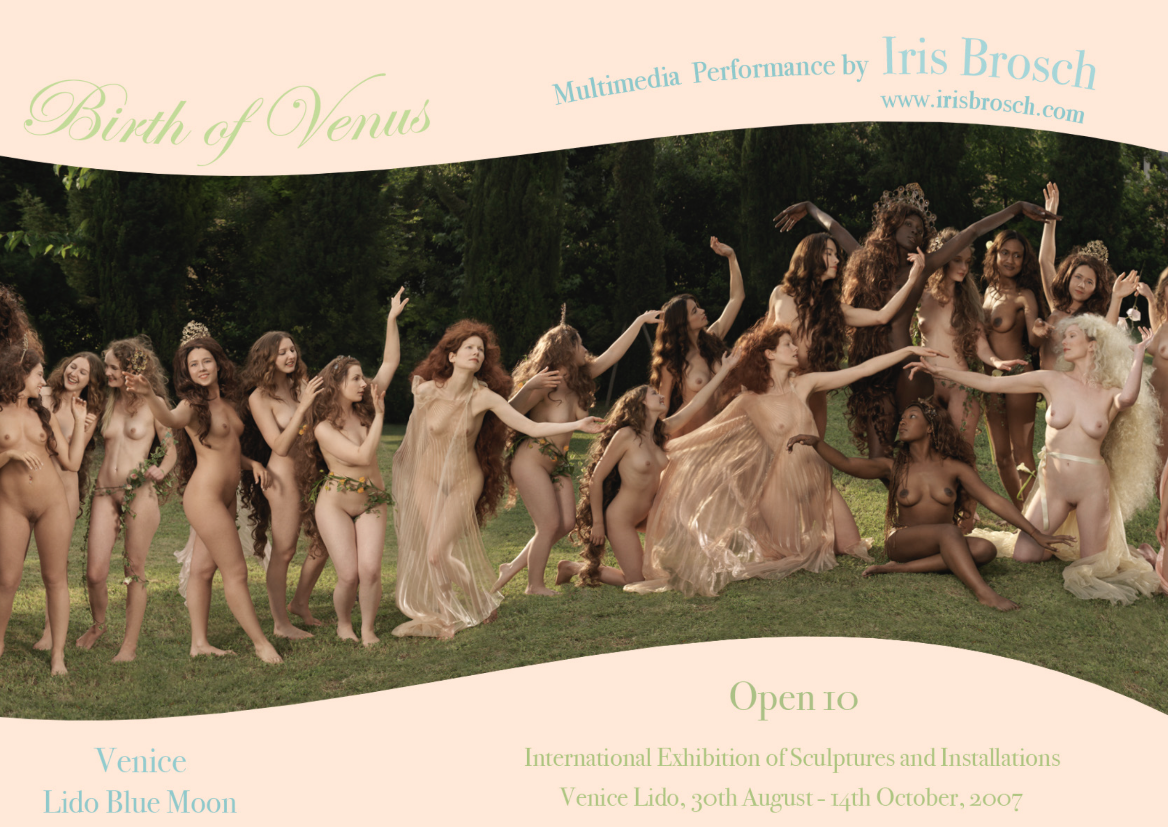 The Blue Moon on the Isola del Lido di Venezia is an architectural beach complex designed by renowned Italian architect Giancarlo De Carlo. Invited by Open 10, Iris Brosch and her team were invited to transform the Blue Moon: a large photographic frieze was wrapped around the space, realized on site by set designer Peter Pfund. The works sparked considerable controversy, as they included nudity and challenged local sensibilities, leaving many Italians both intrigued and unsettled.short description like art name